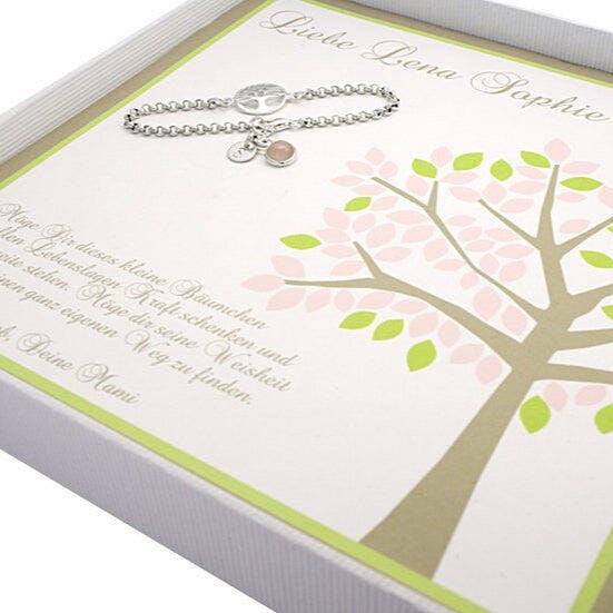 ♡ An der zarten Armkette aus 925 Sterling Silber hängt ein sehr schön gearbeiteter Lebensbaum-Anhänger mit einem Durchmesser von 13 mm, der den kleinen Täufling oder Konfirmanden gerne jeden Tag begleitet, ihm Kraft und Mut gibt. Der kleine fassettierte Rosenquarz misst 6 mm + Öse. Dieser kann auch gegen einen Monatsstein ausgetauscht werden. Das kleine Sterling-Silber-Plättchen misst 8 mm und kann mit einem Initial bestempelt werden.