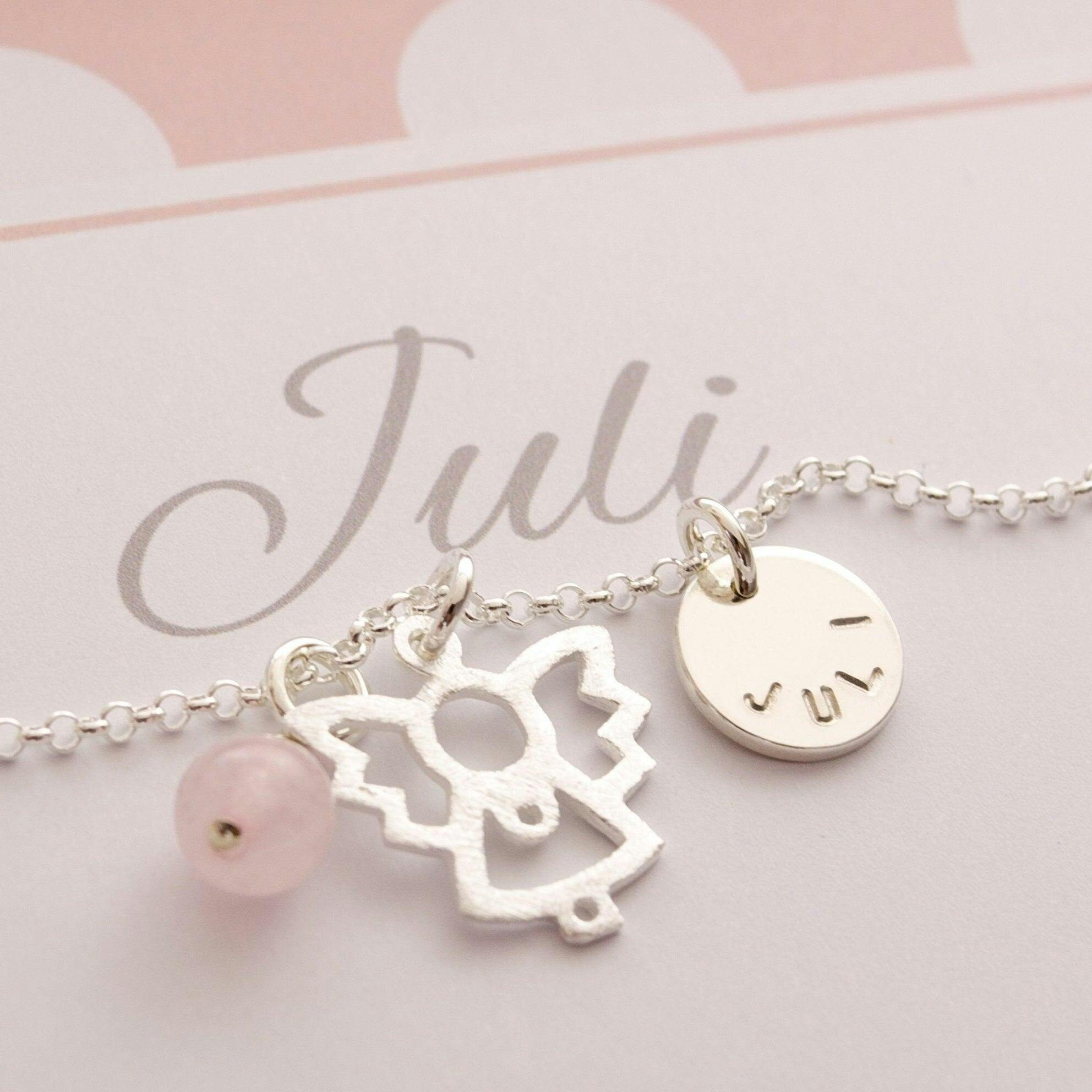 Kette aus 925er Sterling Silber, Engel aus 925 Sterling Silber, Namensplättchen aus 925 Sterling Silber, Rosenquarz mit Echtsilber-Aufhängung, bedruckter Karton.