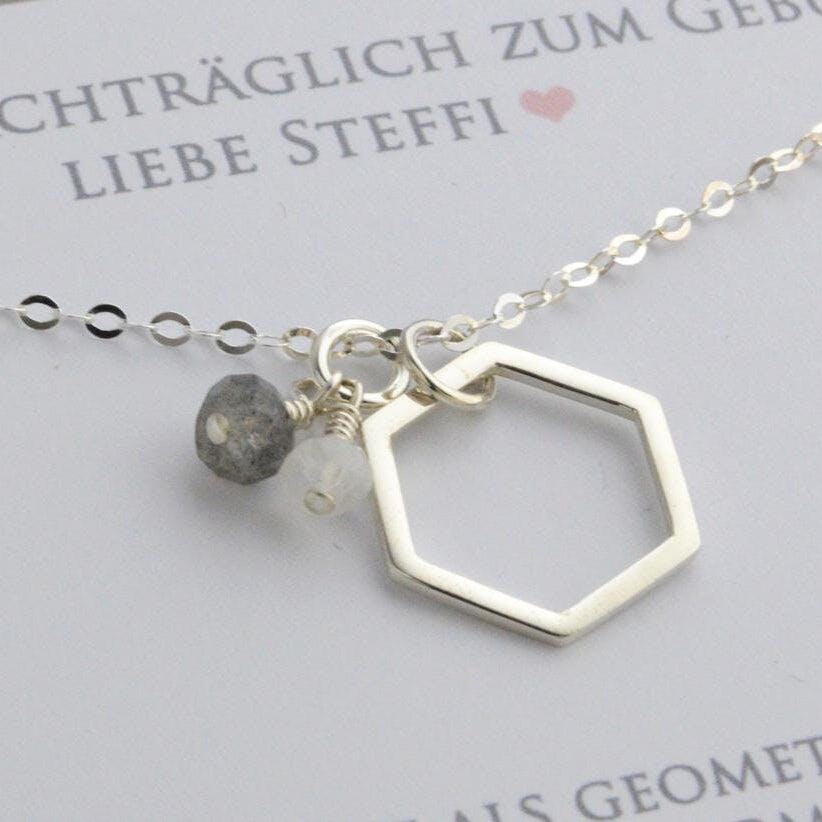 ♡ Sehr schöne Ankerkette mit Hexagon-Anhänger und zwei kleinen Edelsteinen, einem Labradorit und einem Mondstein.