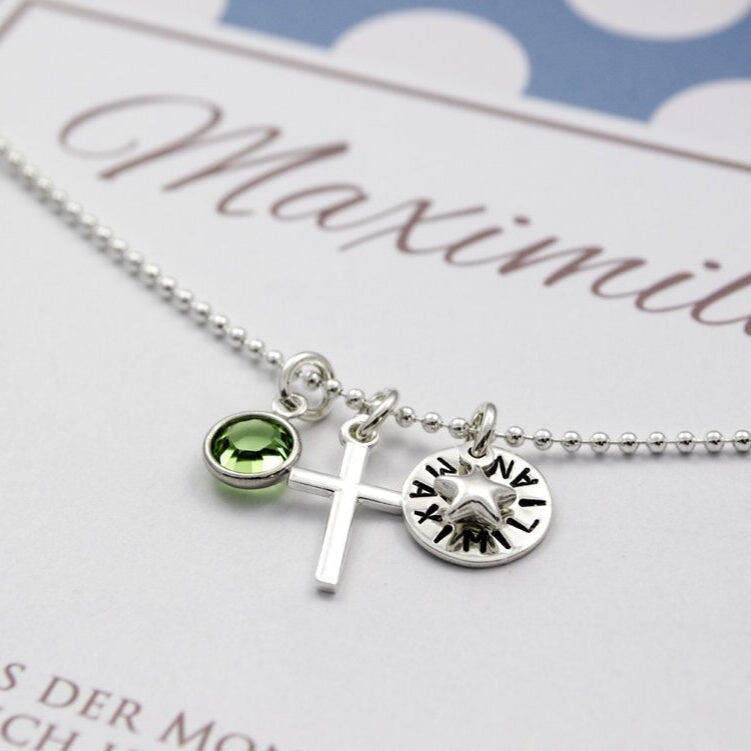 Personalisierte Namenskette mit Gravur, Kreuz, Stern & Stein | 925 Silber