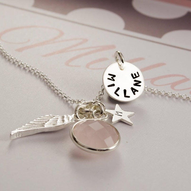 ♡ Traumhaft schöne Kette aus 925 Sterling Silber mit Namensplättchen, gefasstem Rosenquarz, Engelsflügel und Glückssternchen-Anhänger! Der Stern kann auf Wunsch mit einem Buchstaben von Hand bestempelt werden, Z.B. mit dem Anfangsbuchstaben des Täuflings, der Mama, der Patentante...