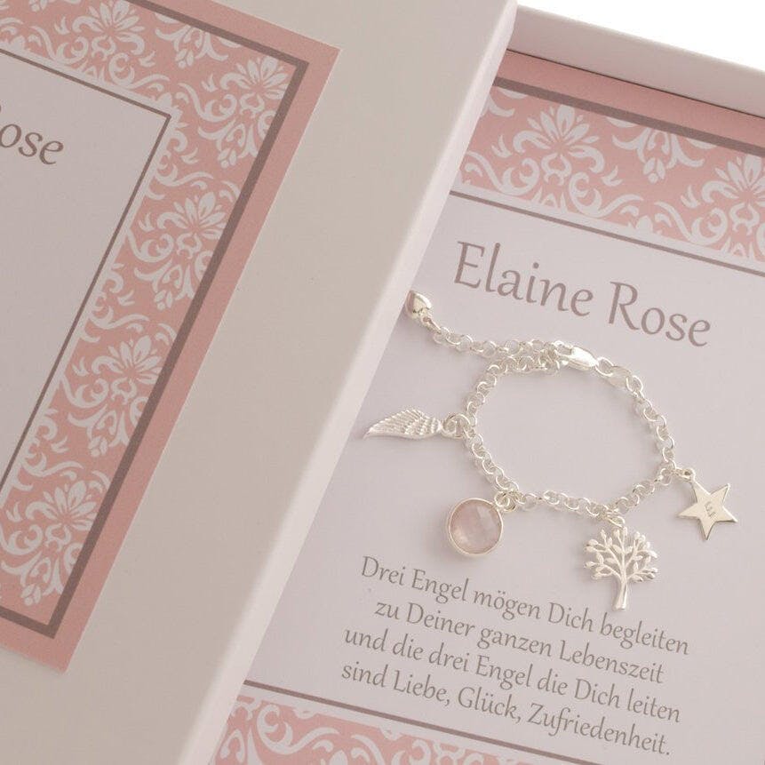 ♡ Süßes zartes Armkettchen aus 925 Sterling Silber mit gefasstem Rosenquarz, Engelsflügel, Lebensbaum und Glücksstern! Der Stern kann auf Wunsch mit einem Buchstaben von Hand gestempelt werden, Z.B. mit dem Anfangsbuchstaben des Täuflings, der Mama, der Patentante...