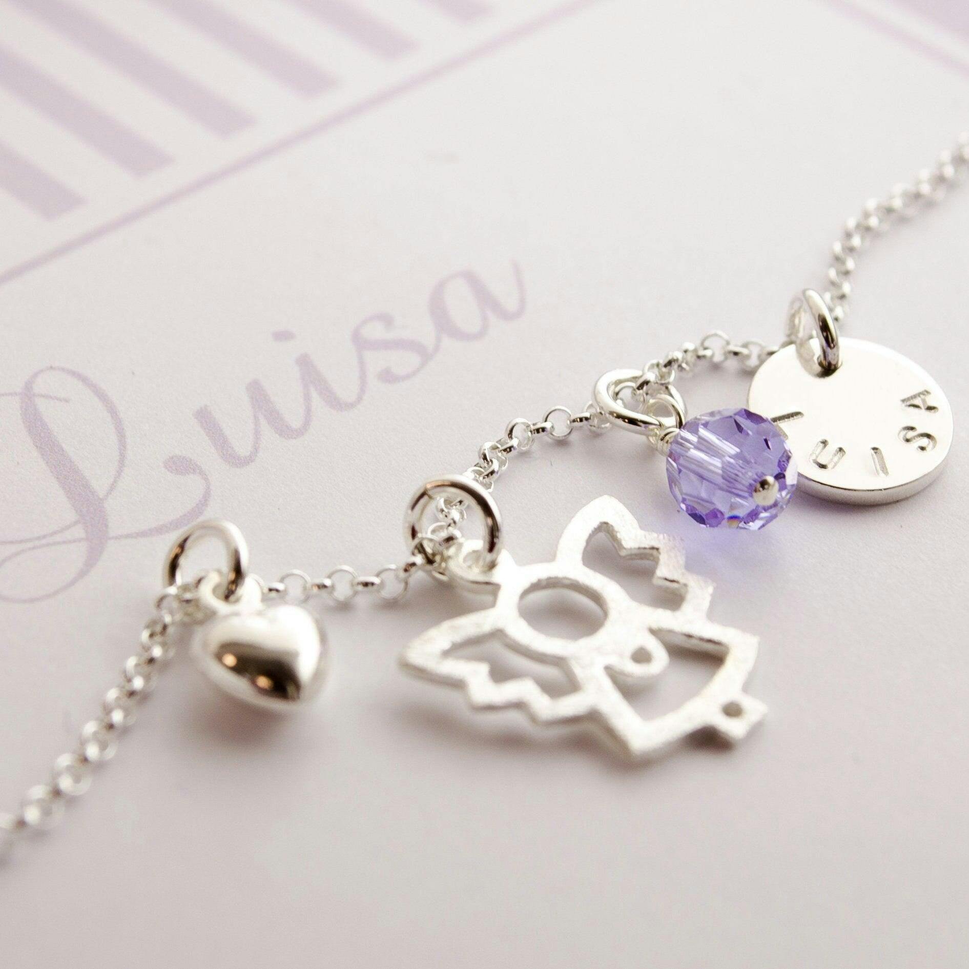♡ Wunderbar zarte Taufkette aus 925 Sterling Silber mit Schutzengel, Herz-Anhänger, Silber-Plättchen mit Wunschnamen und Swarovski Glücksstein in Wunschfarbe. Verschenke diese zauberhafte Kette an Dein Patenkind und gib ihm einen einmaligen Schutzengel mit auf seinen weiteren Lebensweg.