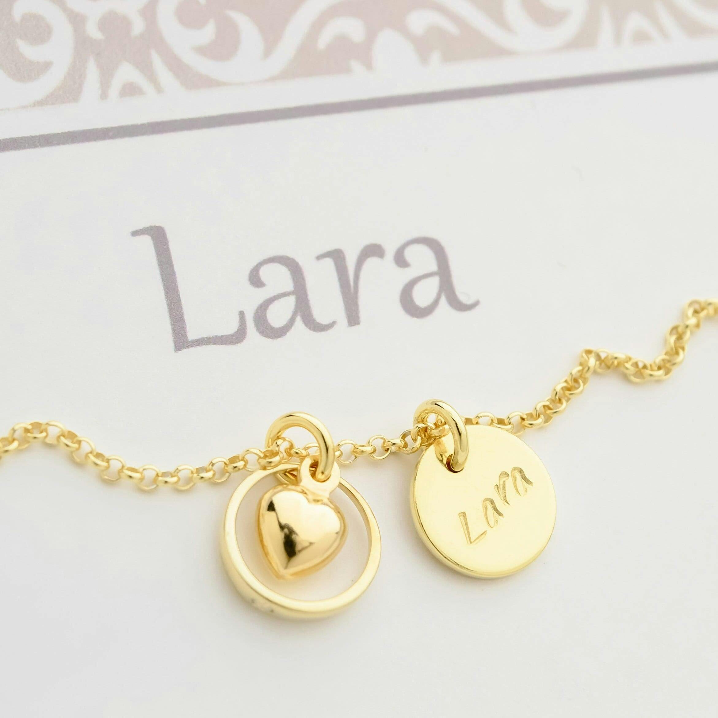 Anhänger: Ein klassischer, vergoldeter Taufring (Ø 15 mm) umschließt ein süßes, bauchiges Herz und ein personalisierbares Namensplättchen (Ø 10 mm).